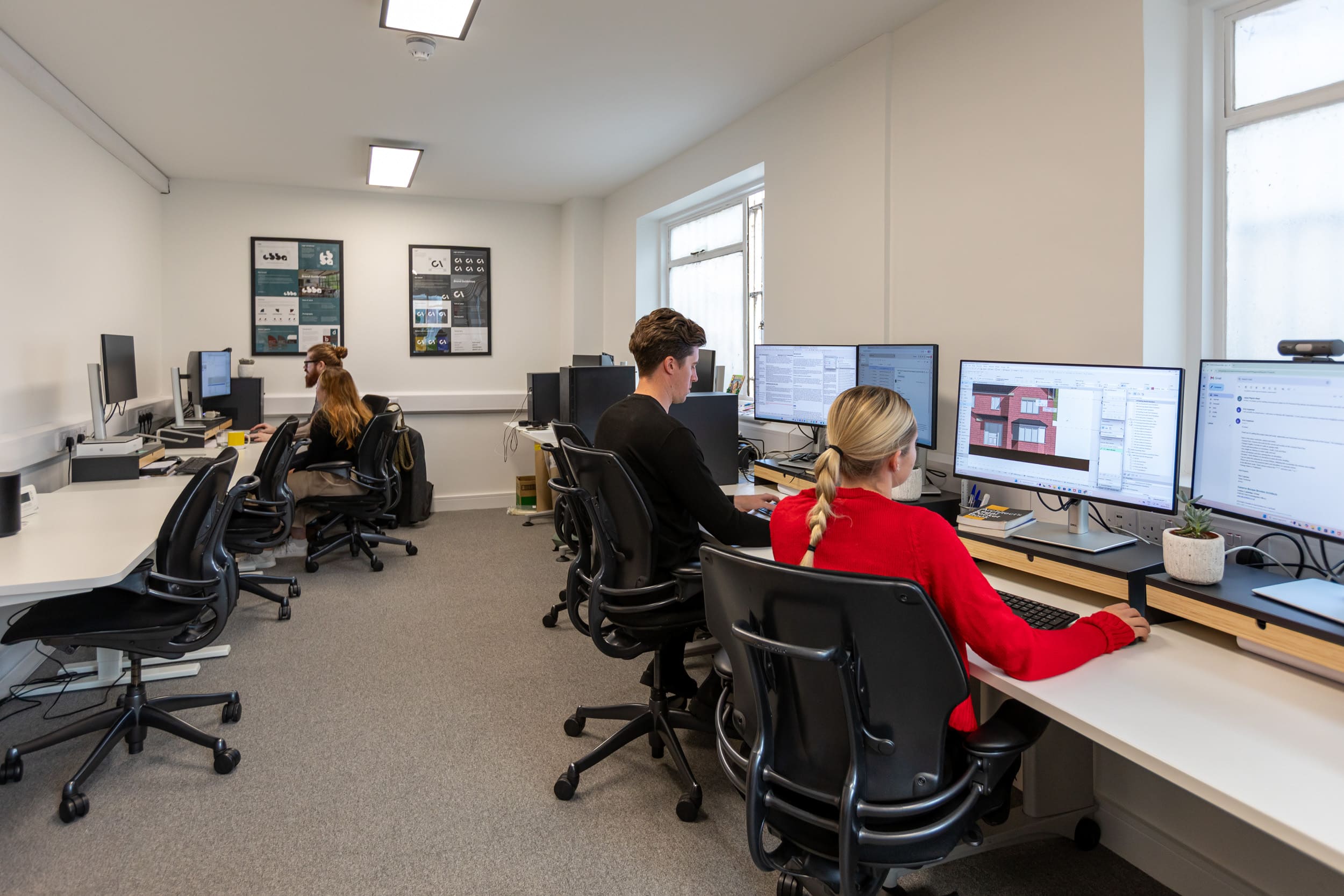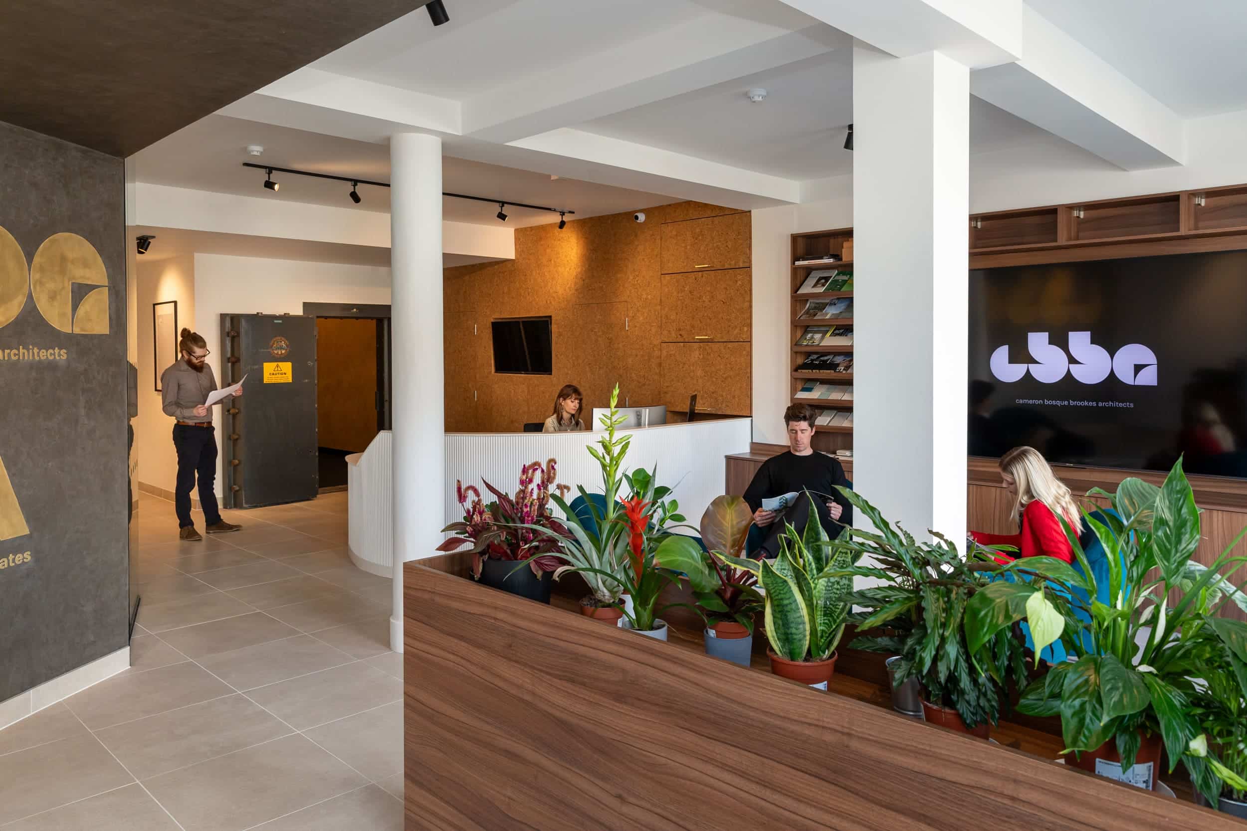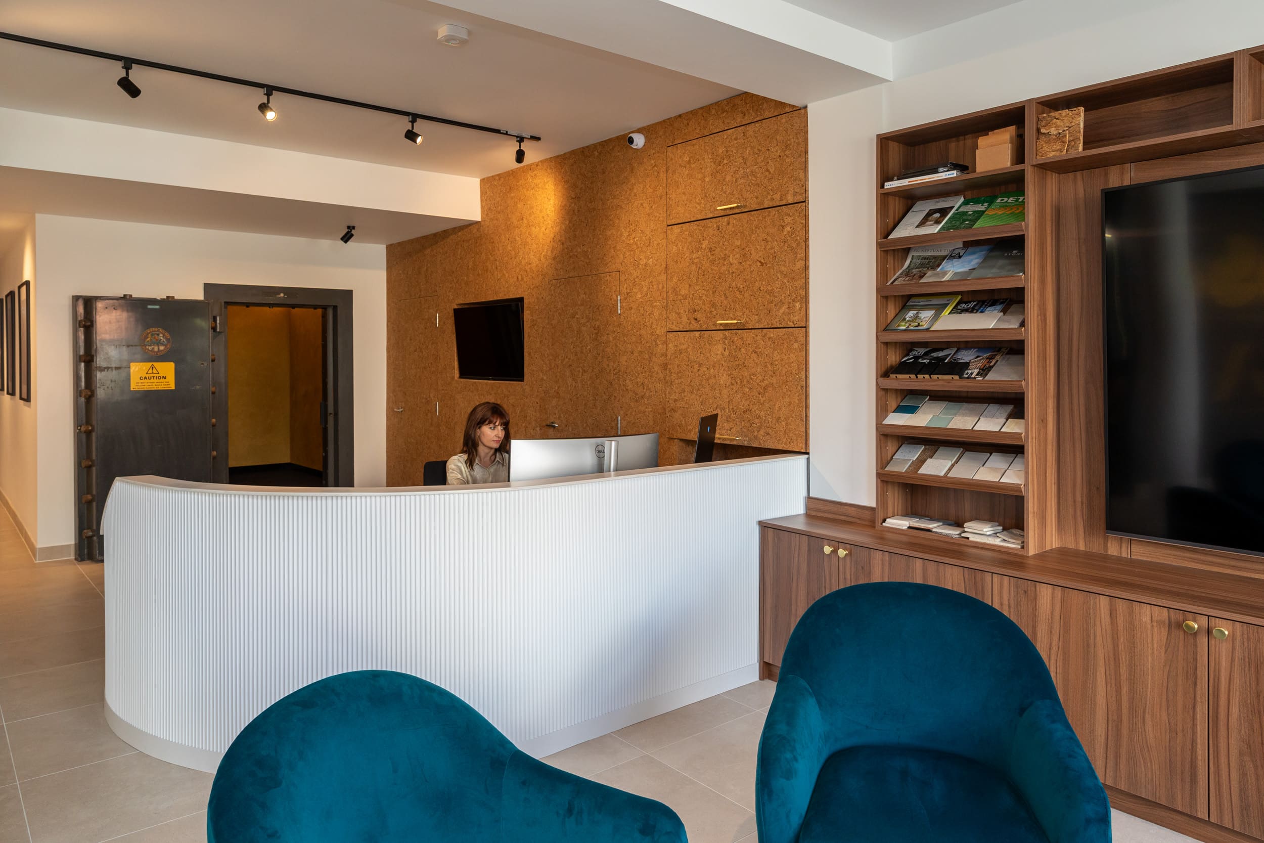 Cat B fit out for CBBA & CA converting an old HSBC bank to an office and event space. The end result has provided an open plan reception waiting area, meeting room, kitchenette, WC with a large private office space for staff. The old bank vault was left in situ and has been finished in a polished gold Venetian plaster and repurposed as a virtual reality room. The reception waiting area has a 100 inch television used for presentations and a beautifully finished curved reception desk in white fluted mdf with marble effect worktop. The meeting room has incorporated CBBA brand colour teal on the floor, wall and ceiling contrasting well with the walnut joinery allowing the meeting room to double up as a library.